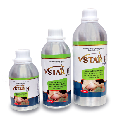 VSTAR H Liquid is a premium animal feed supplement enriched with essential vitamins and minerals to improve udder health, milk production, fertility, growth, and immunity in livestock. Suitable for cattle, buffalo, sheep, horses, dogs, cats, and poultry, it supports better milk yield, faster recovery in diseased animals, and overall reproductive health.